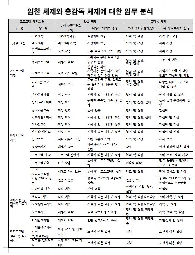 자료집 30여년, 풍부한 현장의 노하우를 전해드립니다. 총감독한 주요 축제 축제 이론 대한민국 축제현황 총감독 체제 분석 국내축제현장스케치 해외축제 현장스케치 대한민국축제컨설팅 축제 멘토링 저서/논문 축제 소식 및 칼럼 제이비축제연구소 소식 공지사항 입찰 체제와 총감독 체제의 업무 비교 분석 *등록일 : 2022-04-14 *조회수 : 604회 ※ 첨부자료 6. 입찰체제와 총감독 체제에 대한 업무 분석.hwp 목록